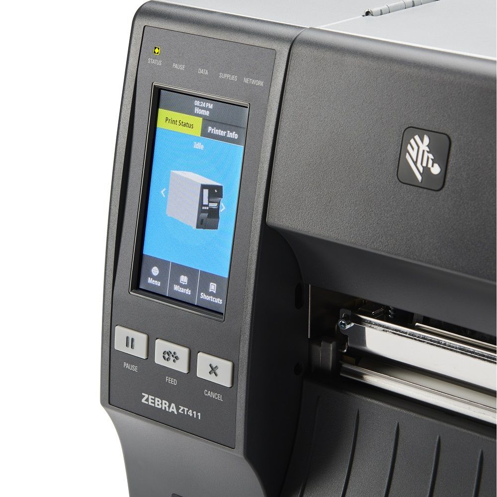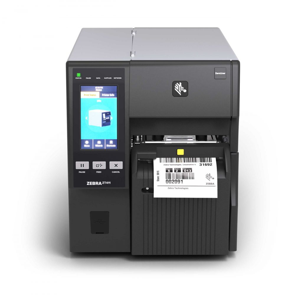 -Imprimante étiquette industrielle Zebra ZT411 Linerless avec massicot, transfert thermique en 203 dpi et 104 mm de largeur d’impression, écran couleur tactile, langage ZPL et EPL, 64Mo de mémoire flash avec RTC (Real Time Clock), port USB, série, Ethernet 10/100 et Bluetooth 2.1, avec USB Host.