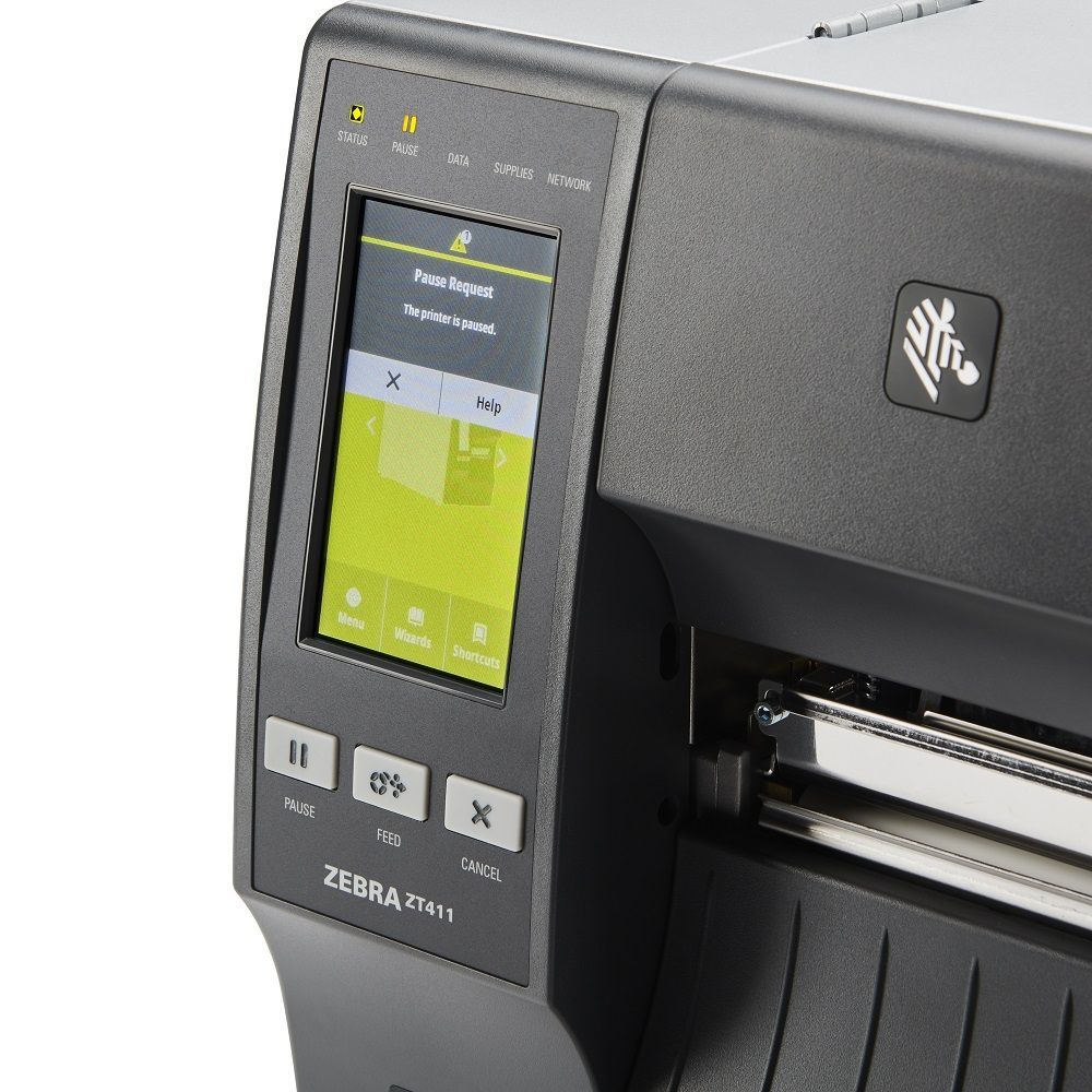 -Imprimante étiquette industrielle Zebra ZT411 Linerless avec massicot, transfert thermique en 300 dpi et 104 mm de largeur d’impression, écran couleur tactile, langage ZPL et EPL, 64Mo de mémoire flash avec RTC (Real Time Clock), port USB, série, Ethernet 10/100 et Bluetooth 2.1, avec USB Host.